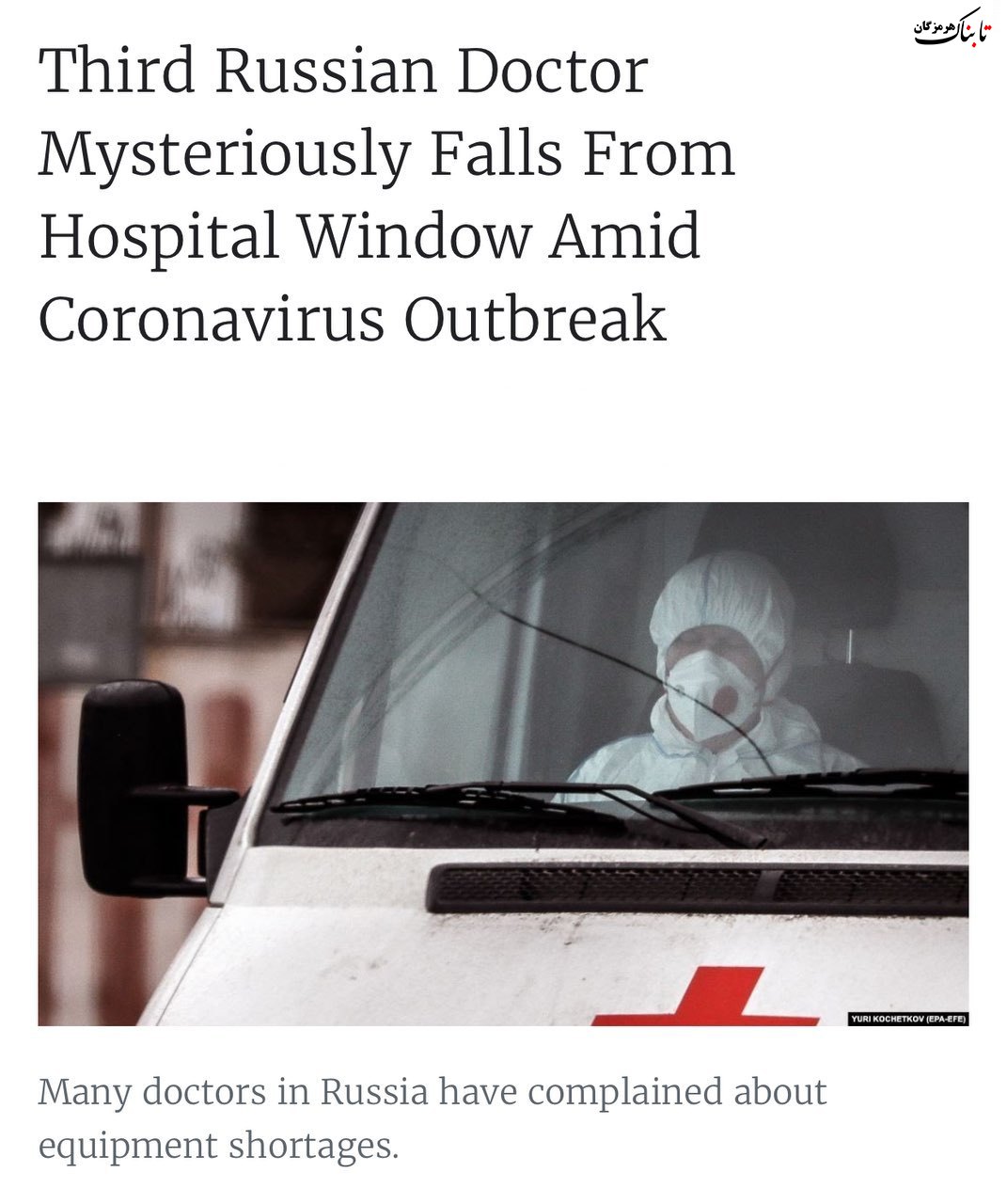 در هفته اخیر، سه دکتر در روسیه که به درمان بیماران مبتلا به کرونا میپرداختند از پنجره ساختمانها به بیرون پرت شدهاند. دو نفر از این پزشکان کشته شدهاند و یک نفر در شرایط حاد قرار دارد. علت حوادث هنوز مشخص نیست اما دو نفر از پزشکان پیش از حادثه نسبت به شرایط درمانی معترض بودند.