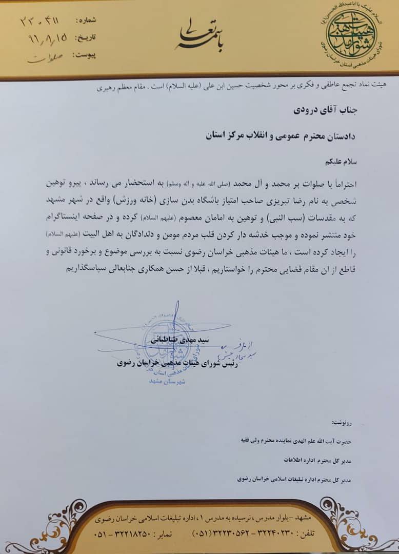احتراما با صلوات بر محمد و آل محمد به استحضار می رساند، پیرو توهین شخصی به نام رضا تبریزی صاحب امتیاز باشگاه بدن سازی (خانه ورزش) واقع در شهر مشهد که به مقدسات ( سب النبی ) و توهین به امامان معصوم (ع) کرده و در صفحه اینستاگرام خود منتشر نموده و موجب خدشه دار کردن قلب مردم مومن و دلدادگان به اهل بیت (ع) را ایجاد کرده است، ما هیئات مذهبی خراسان رضوی نسبت به بررسی موضوع و برخورد قانونی و قاطع از آن مقام قضایی محترم را خواستاریم، قبلا از حسن همکاری جنابعالی سپاسگذاریم.